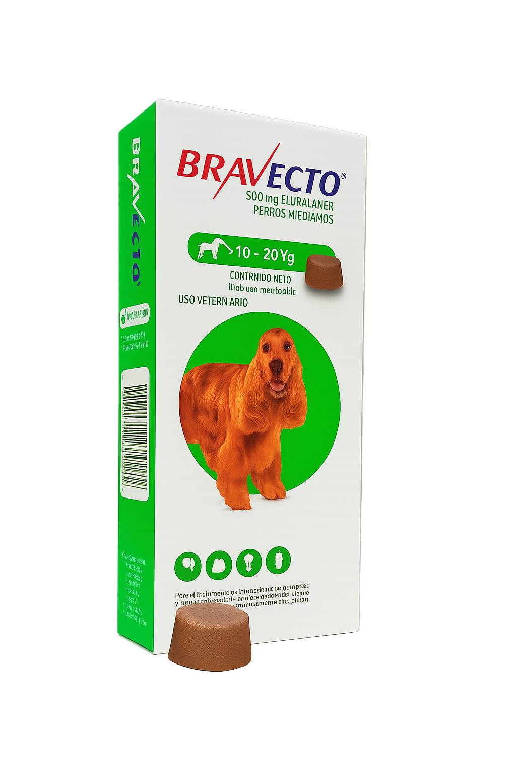 Ofrece a tu perro una protección de larga duración con Bravecto 500 mg, la tableta masticable con fluralaner que elimina pulgas y garrapatas hasta por 12 semanas con una sola dosis trimestral. Perfecta para perros de 10 a 20 kg, de sabor tan irresistible que muchos la aceptan voluntariamente.