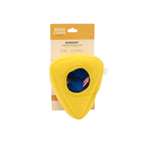 Este juguete combina creatividad y estímulo para gatos: se trata de un bloque con forma de “queso” forrado con papel crujiente, en cuyo interior se esconden dos ratoncitos de peluche rellenos de catnip (hierba gatera). Los felinos pondrán en práctica sus instintos de caza —palpar, tirar, extraer los ratones— generando actividad física, mental y diversión prolongada.