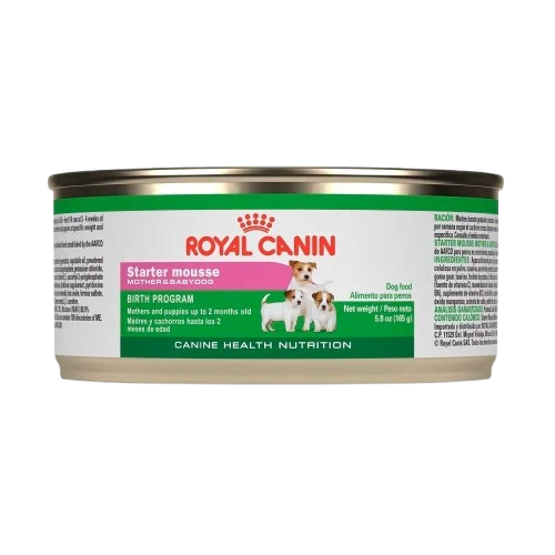 La lata Royal Canin Starter Mousse es un alimento húmedo diseñado específicamente para hembras en la fase final de la gestación y durante la lactancia, así como para cachorros desde el destete hasta los 2 meses de edad.