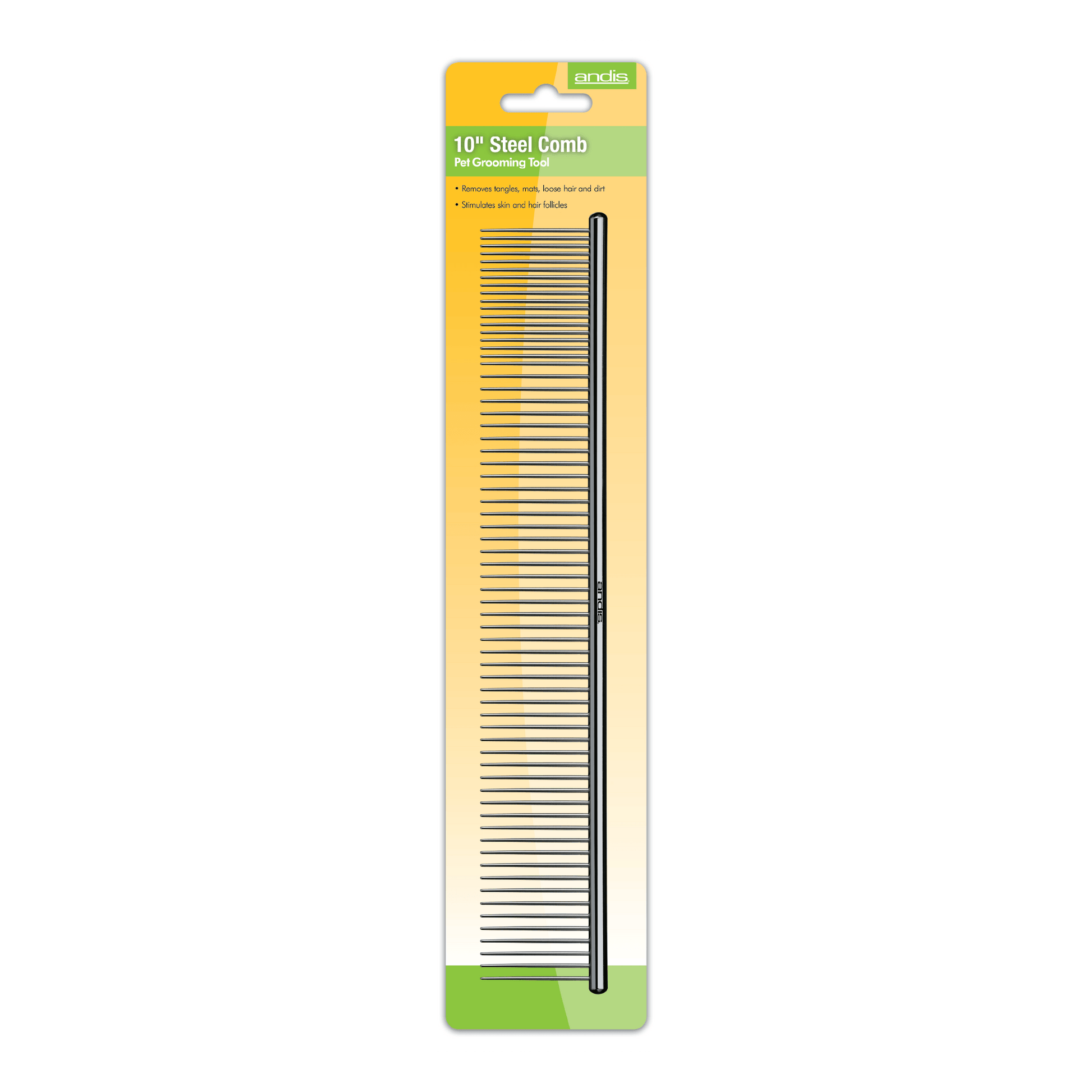 El peine de acero inoxidable ANDIS® 250 mm (10") es una herramienta profesional diseñada para el cuidado y mantenimiento del pelaje de perros y gatos. Fabricado con acero de alta calidad, ofrece una gran durabilidad, resistencia a la corrosión y un deslizamiento suave que no daña la piel del animal.