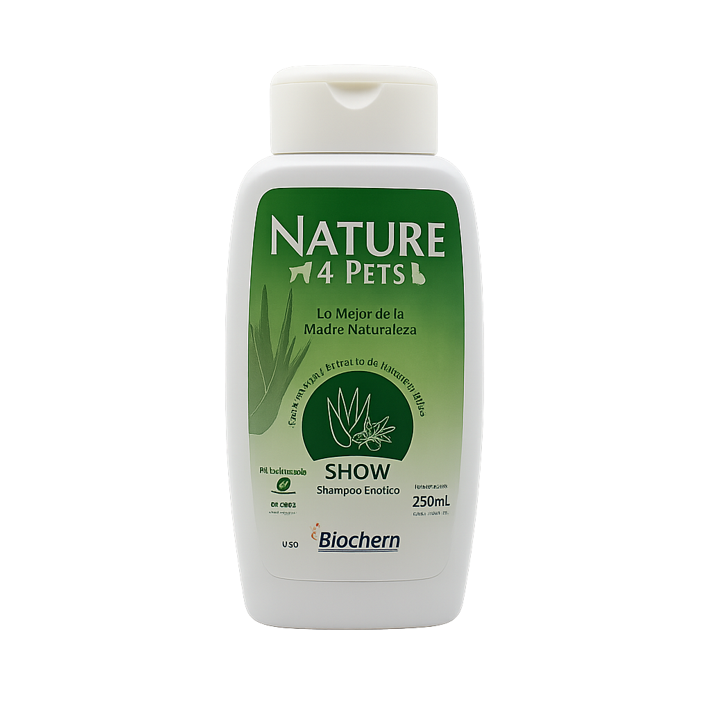 Shampoo de ingredientes naturales y suave fragancia, ideal para exhibición (Show), formulado con extractos de avena, manzanilla, aloe vera, aceite de jojoba y aceite de oliva. Aporta limpieza profunda, suavidad y ayuda a proteger la piel sensible, reduciendo irritación y resequedad.