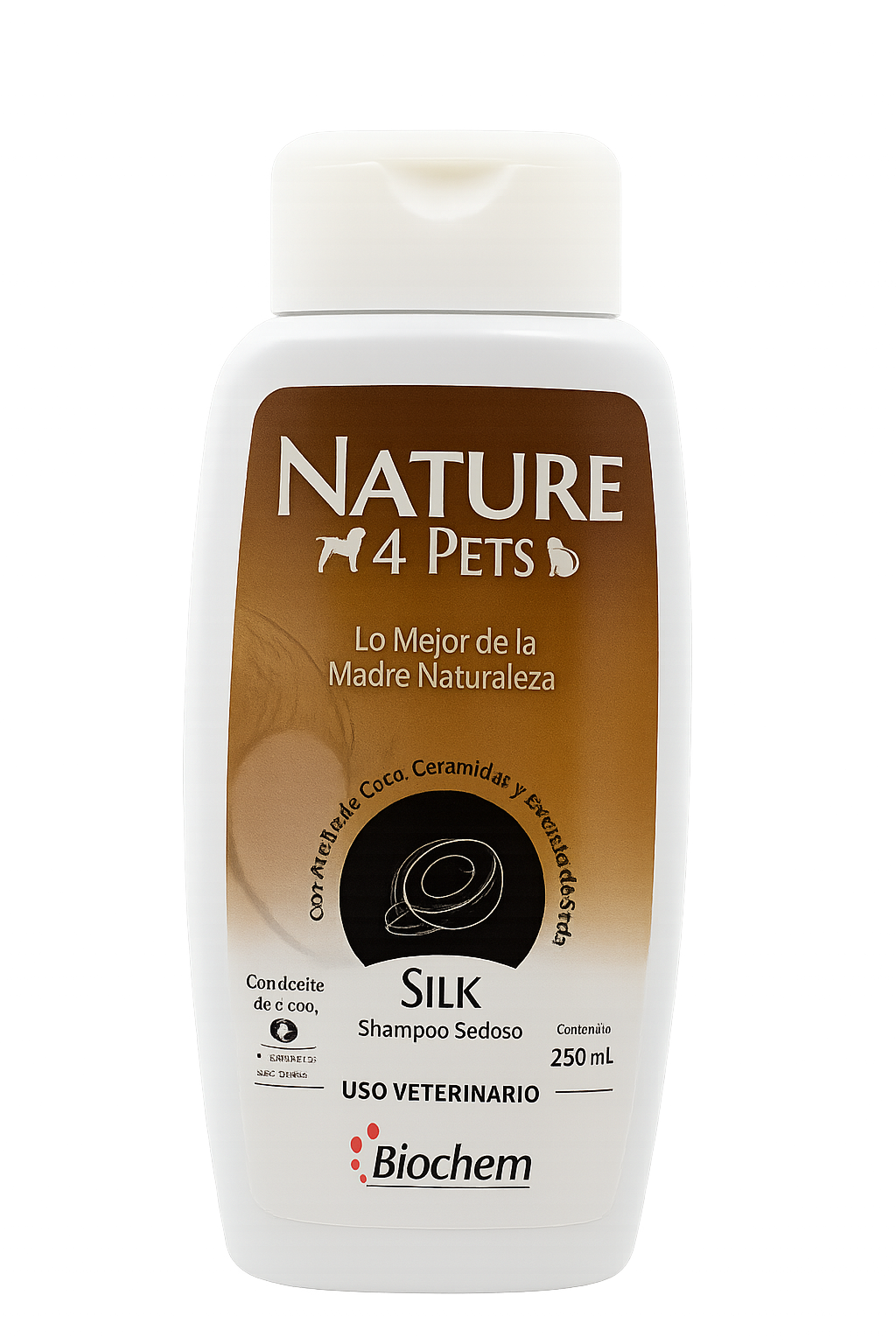 Shampoo formulado para perros y gatos con ingredientes naturales y proteínas de seda que limpian profundamente, suavizan, rehidratan y mejoran el brillo del pelaje. Libre de jabones y detergentes agresivos, está equilibrado para piel sensible y uso frecuente, ideal para mascotas que requieren un cuidado especial de su pelo.